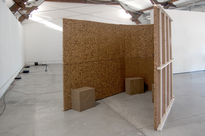 Micro-architecture pour diffusion d’enregistrements sonores. Panneaux de liège, tasseaux en pin et haut-parleur large-bande. 200 x 250 x 150 cm, 2013